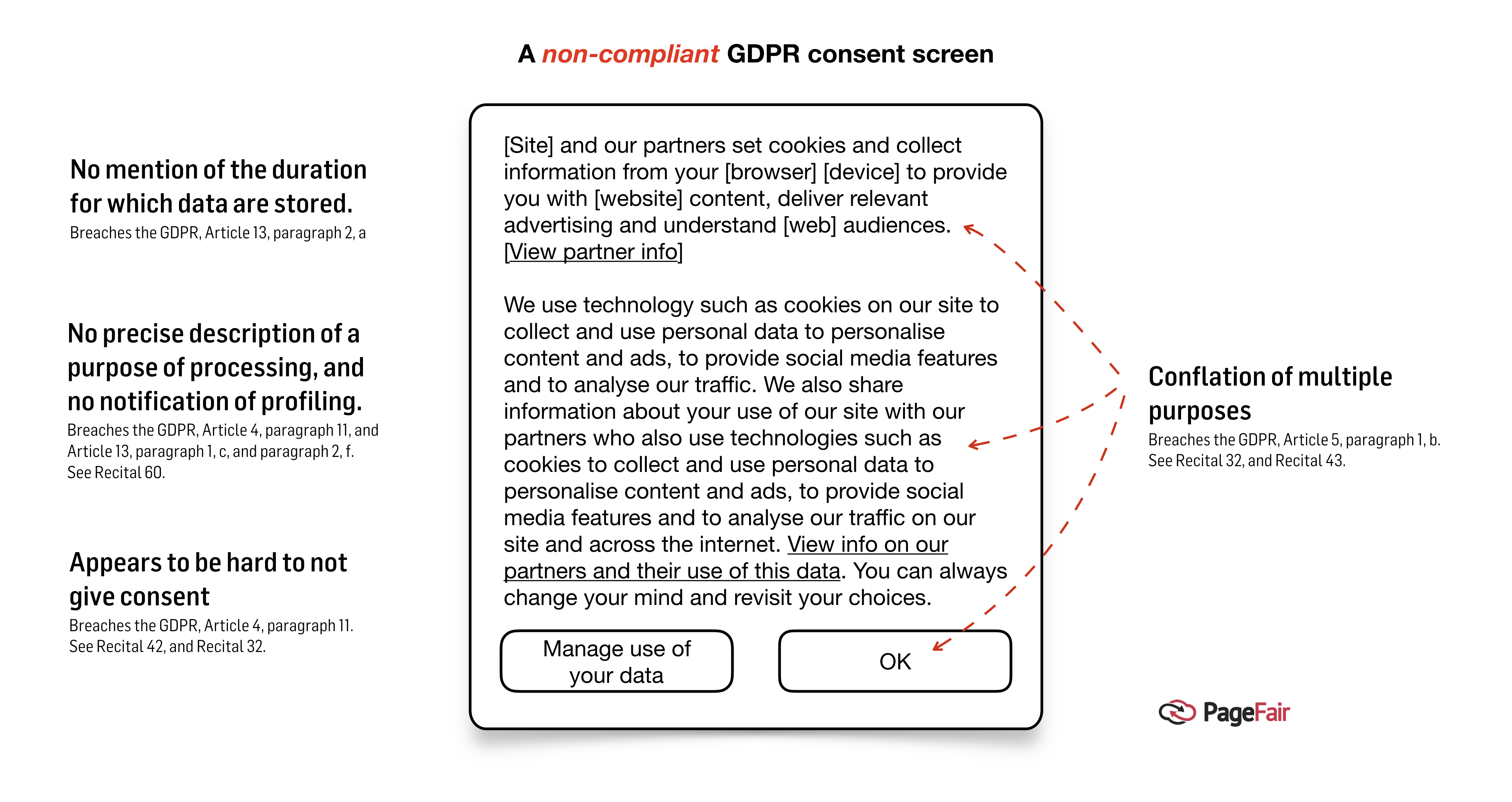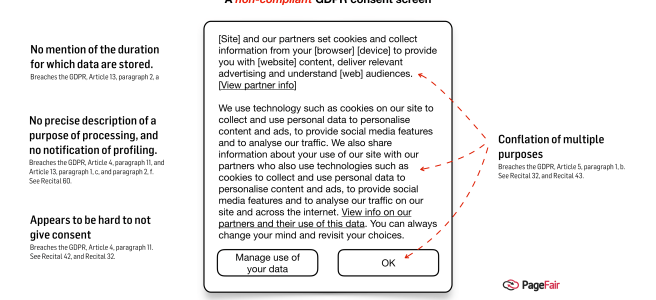 [16] See discussion of data processing purposes in online behavioural advertising, and the degree of granularity required in consent, in “GDPR consent design: how granular must adtech opt-ins be?”, PageFair Insider, January 2018 (URL: https://pagefair.com/blog/2018/granular-gdpr-consent/).